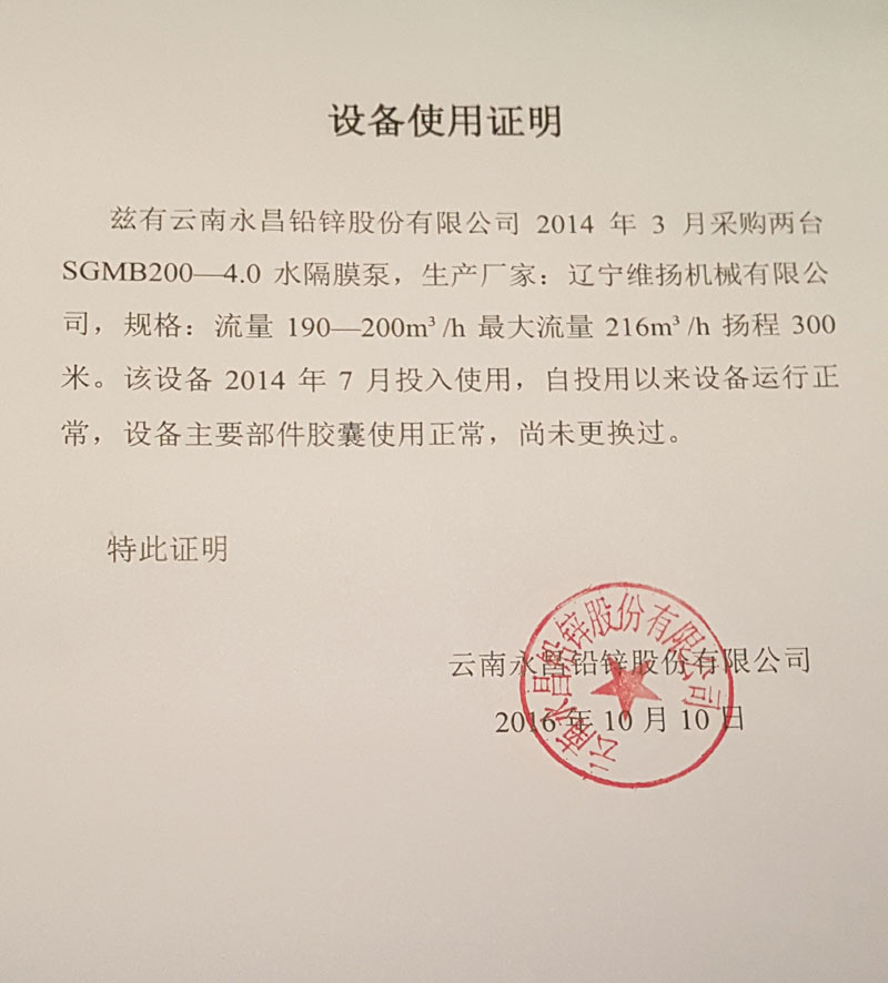 云南永昌鉛鋅礦,隸屬中鋁集團(tuán)。是2014年7月運(yùn)行的水隔膜泵,也是二臺(tái),一用一備,流量200m3/h,揚(yáng)程2.5Mpa,該泵比二道溝礦的水隔膜泵有所改進(jìn)。運(yùn)行也更加平穩(wěn),自2014年運(yùn)行至今已整整五年,六個(gè)隔膜一個(gè)沒(méi)壞,備件費(fèi)用也極少。