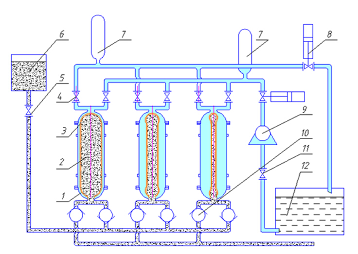 (1)罐體(2)尾礦(3)隔膜(4)清水閥(5)三片閥(6)喂料箱(7)穩(wěn)壓灌(8)三片閥(9)清水泵(10)逆止閥(11)閘閥(12)清水池